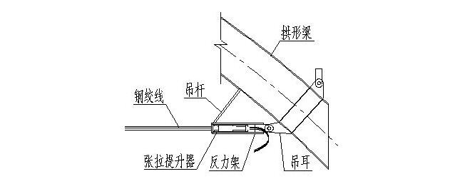 提升過程中,弧形鋼梁兩端處于自由狀態(tài),其自重產(chǎn)生的水平分力很大,為防止提升過程中鋼梁向吊點(diǎn)外伸出并伸長變形,保證結(jié)構(gòu)的穩(wěn)定性,提升過程中需在吊點(diǎn)位置鋼梁底部增設(shè)水平張拉措施,防止其變形,滿足設(shè)計(jì)及提升工藝要求。鋼梁底部水平拉索張拉采用液壓提升器及鋼絞線進(jìn)行張拉,具體措施如圖4所示。