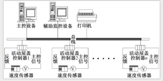 開(kāi)合屋蓋結(jié)構(gòu)的控制系統(tǒng)是實(shí)現(xiàn)活動(dòng)屋蓋開(kāi)啟與閉合動(dòng)作的精密管控體系,具有監(jiān)測(cè)、反饋及調(diào)節(jié)功能,向驅(qū)動(dòng)系統(tǒng)發(fā)出各種運(yùn)行指令,及時(shí)消除屋蓋運(yùn)行中出現(xiàn)的卡軌、干涉、蛇行等隱患。活動(dòng)屋蓋控制系統(tǒng)的框架圖如圖所示。